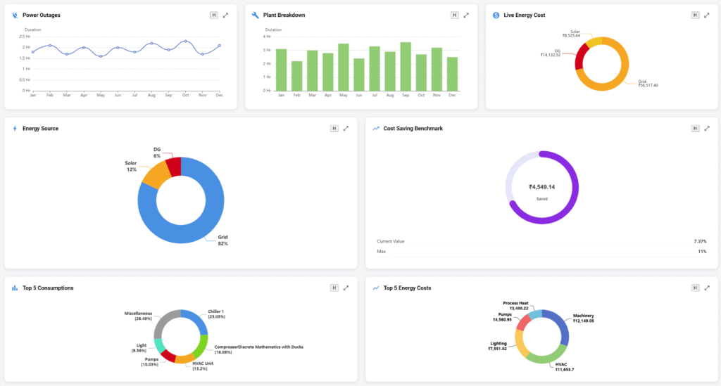 - HO view: Top 5 devices/plants by energy cost, PF issues, downtime, etc.