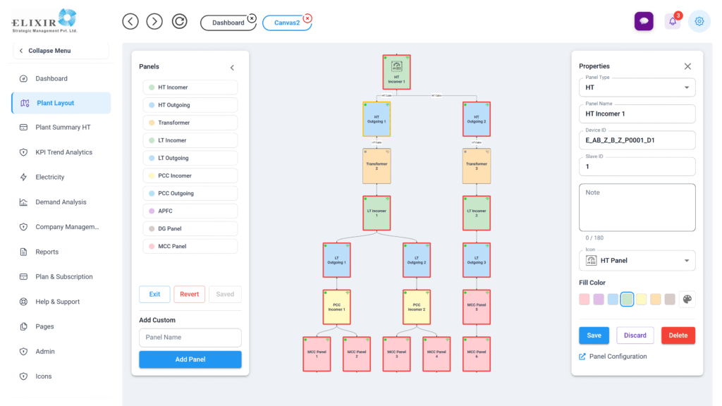 • Shows live status of HT, LT, MCC, DG, utilities, etc.
